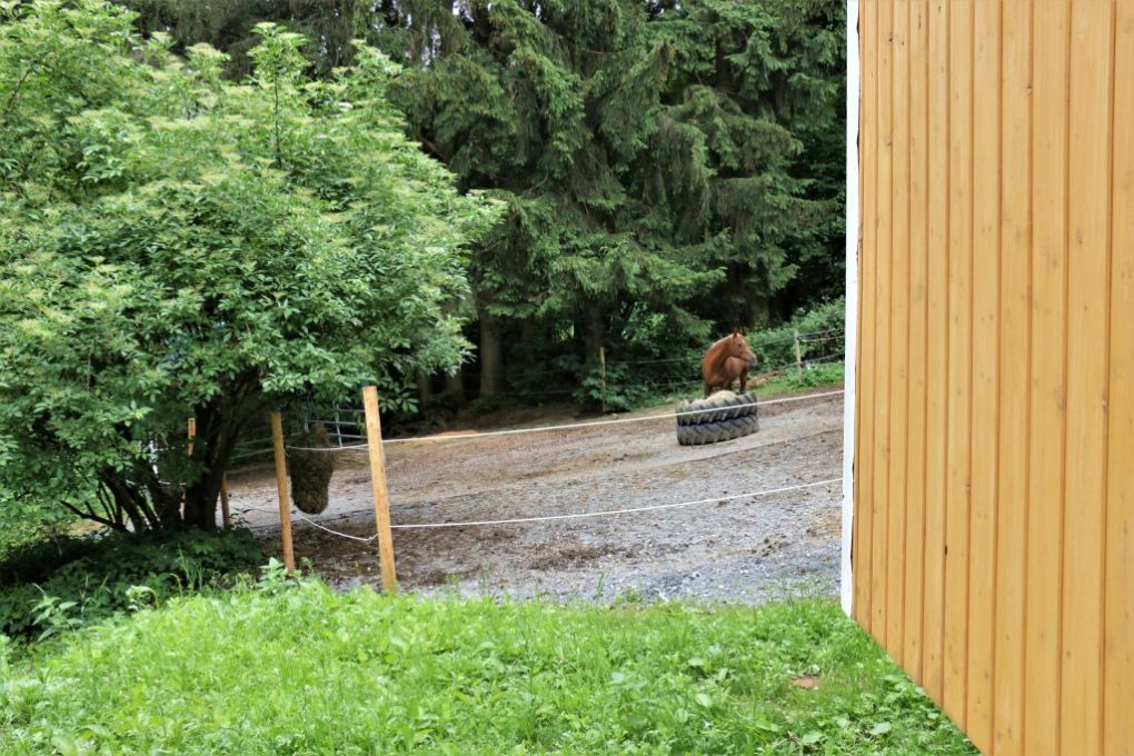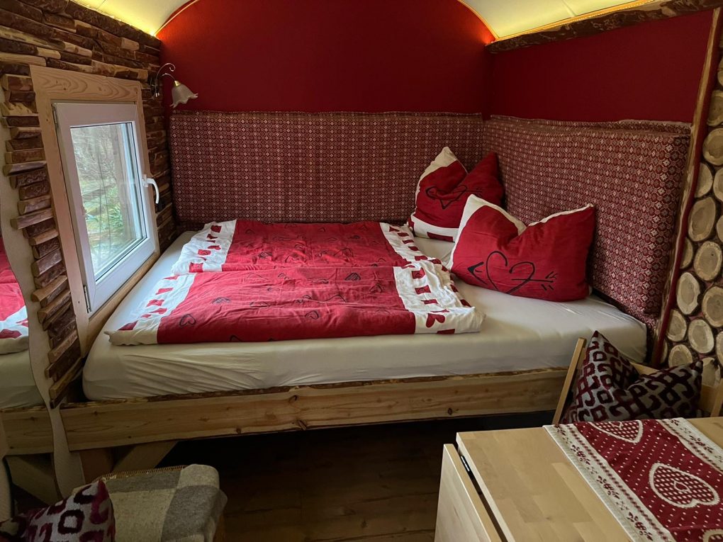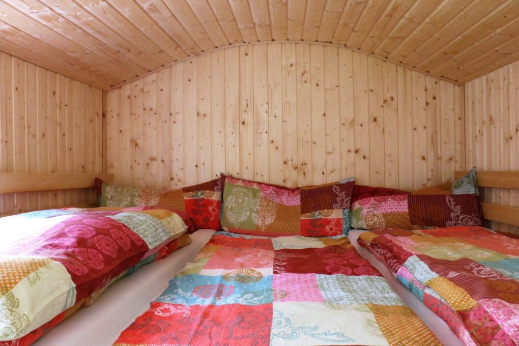 Unser Schäferwagen „Waldruhe“ (für bis zu 3 Erwachsene und 2 kleinere Kinder) ist für diejenigen besonders geeignet die gerne ihre Ruhe haben möchten und vom Treiben am Hof nichts mitbekommen wollen. Dieser befindet sich oberhalb unseres Reitplatzes am Ende des Grundstückes. Ohne über den Hof zu müssen, kann man von hier aus direkt in den Wald spazieren gehen. Der Lagerfeuerplatz, der ca 1x pro Woche genutzt wird befindet sich nebenan und kann auch von euch privat genutzt werden. Je nach Alter der Kinder, können hier bis zu 4 Personen schlafen. Einweiteres Zelt könnte man außerhalb aufstellen.
