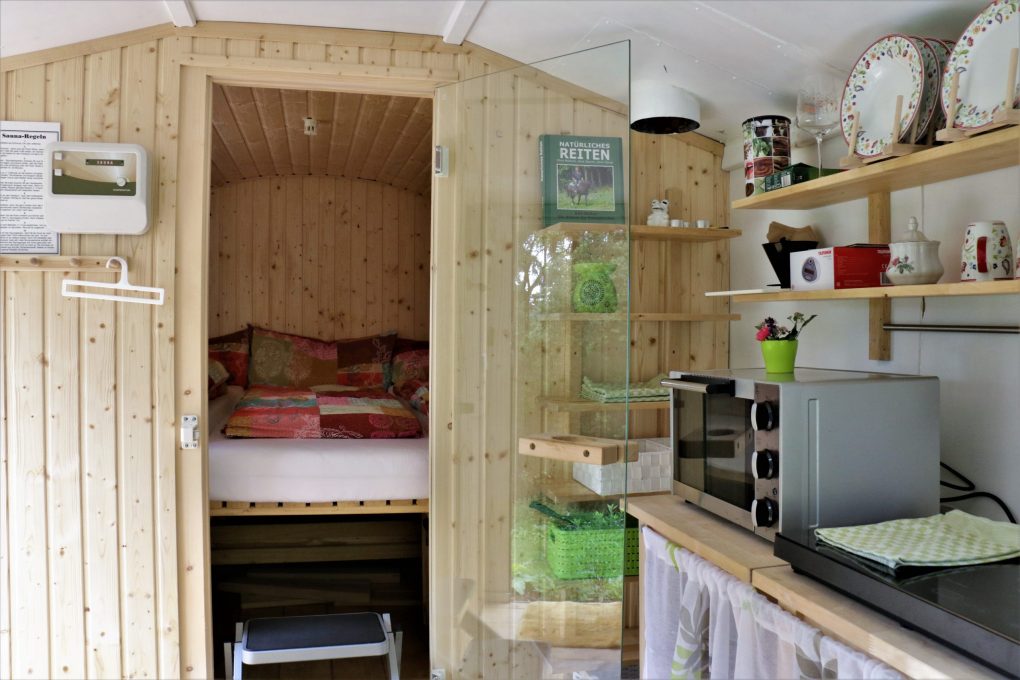 Ihr wohnt bei uns in liebevoll eingerichteten Schäferwagen. Diese sind unterschiedlich weit vom Haus entfernt und teilweise mitten im Pferdeauslauf. An Innenausstattung lassen sie keine Wünsche offen. Induktionskochfelder, Grill, Backofen und Kühlschrank bieten die Möglichkeit, sich komplett selbst zu versorgen. Die Wasserversorgung funktioniert ähnlich wie in Wohnwägen, über Frischwasserkanister. Wer es ganz urig mag, nutzt die umweltfreundlichere Variante der Solarduschen/Pumpduschen und die Komposttoiletten der jeweiligen Wägen. Wer den Luxus eines Bades nicht missen möchte, hat die Möglichkeit ab 01.05. unser Badehäuschen zu besuchen oder unser Gästebad im ersten Stock unseres Wohnhauses zu nutzen. Bitte verlassen Sie dieses sauber das sich auch der nächste Gast dort wohlfühlen kann. Vom 01.05.-31.09. ist unser Außenpool nutzbar soweit es das Wetter zulässt. Unsere Sauna ist vom 01.10.-31.03. buchbar ansonsten auf Anfrage.