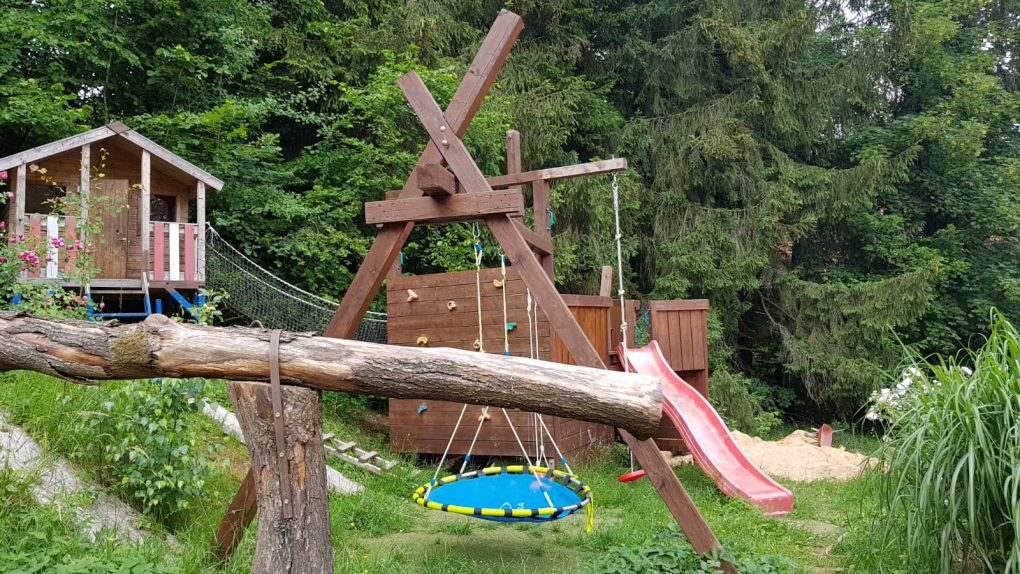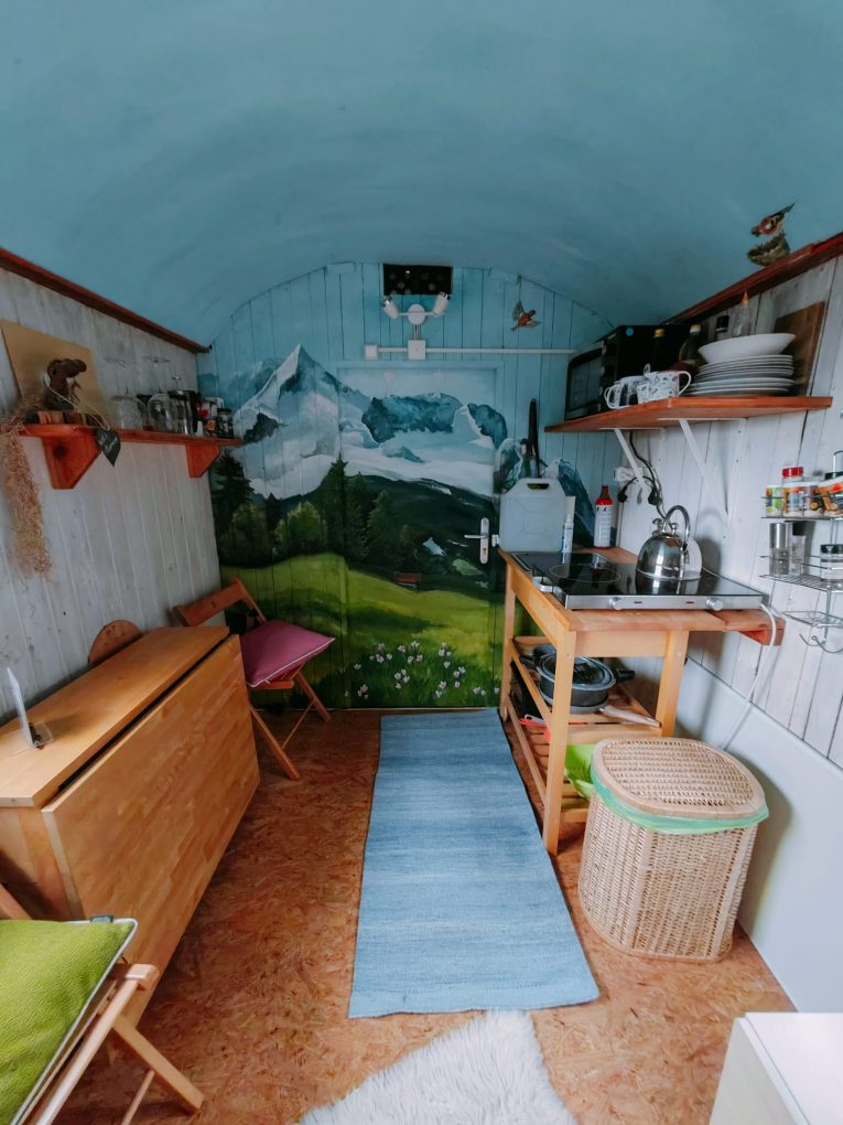 Unser 1. Schäferwagen und mein kleiner Liebling, ist unser Schäferwagen „Waldkäutzchen“ (für bis zu 2 Personen) oberhalb des Hauses. Meine damalige Mitarbeiterin und Künstlerin Verena Schmid hat mir die Zugspitze in den Wagen gemalt, was ihm ein ganz besonderes Flair verleiht. Ich liebe die Berge… Dieser Wagen steht oberhalb des Hauses mitten im Pferdeauslauf. Vom eigenen Garten aus, kann man das Treiben am Hof unten mitverfolgen, ist aber weit genug weg um seine Ruhe genießen zu können. Hinter dem Haus befindet sich noch ein Hängesessel in einem alten Apfelbaum.
